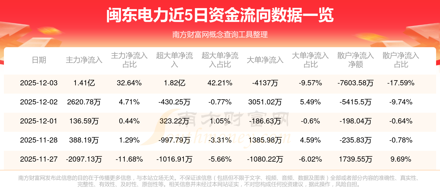 12月3日消息,閩東電力資金凈流入1.41億元,超大單資金凈流入1.82億元,換手率17.83%,成交金額10.96億元。