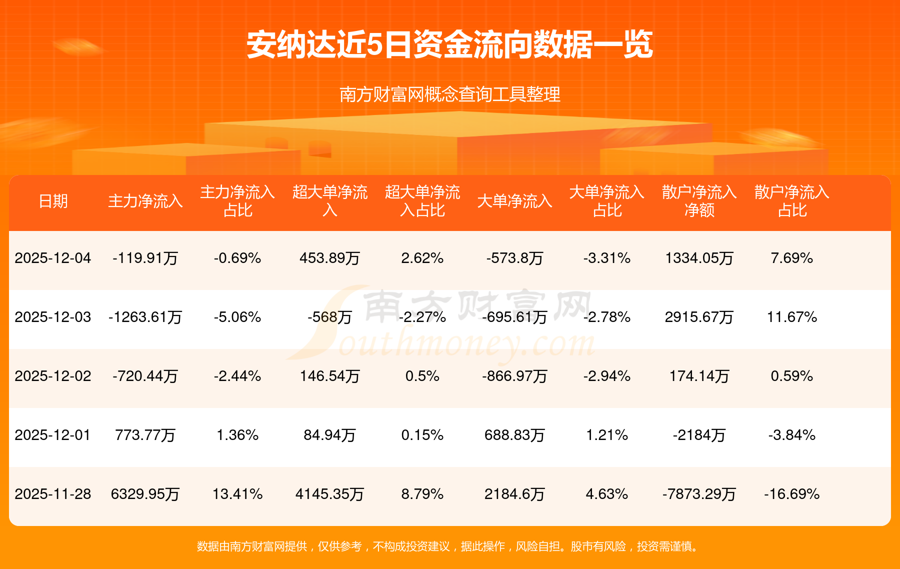 12月4日消息,安納達資金凈流出119.91萬元,超大單資金凈流入453.89萬元,換手率6.5%,成交金額1.73億元。