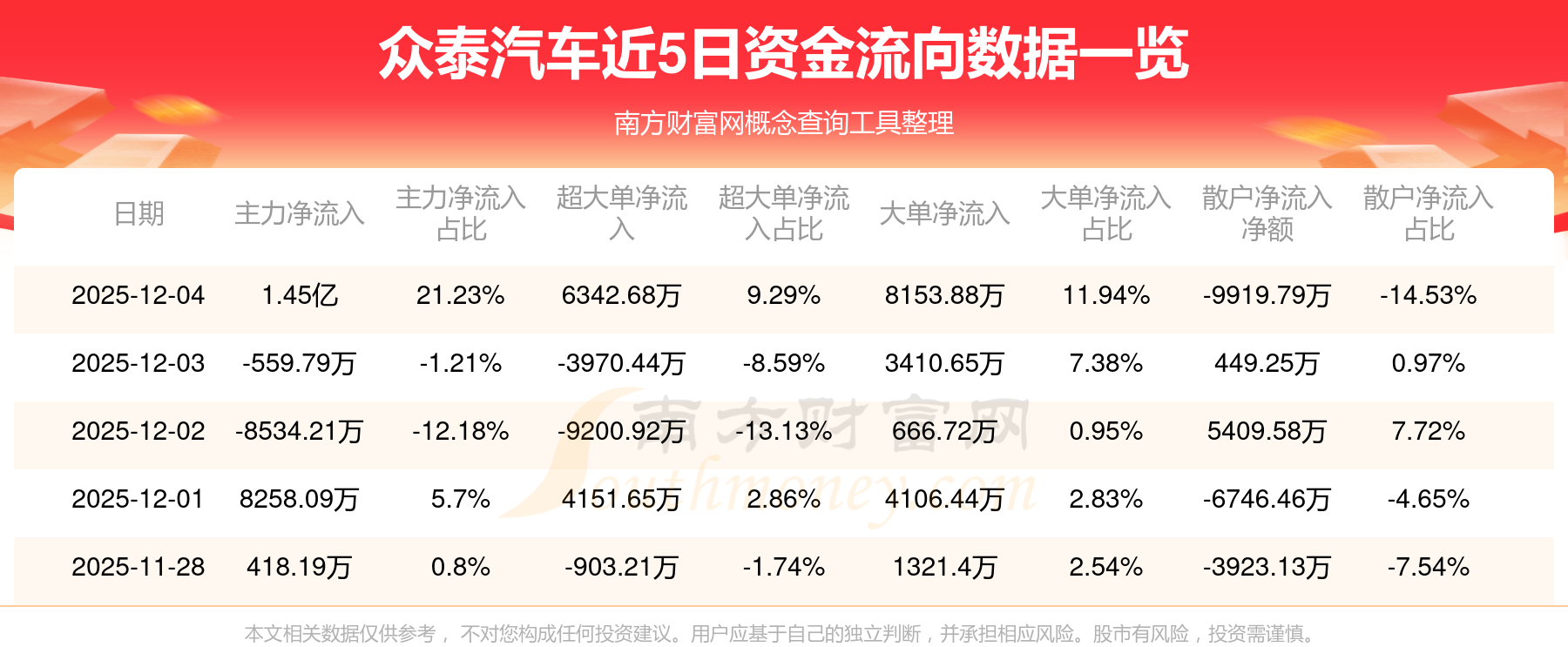 12月4日消息,眾泰汽車(chē)資金凈流入1.45億元,超大單資金凈流入6342.68萬(wàn)元,換手率3.63%,成交金額6.83億元。