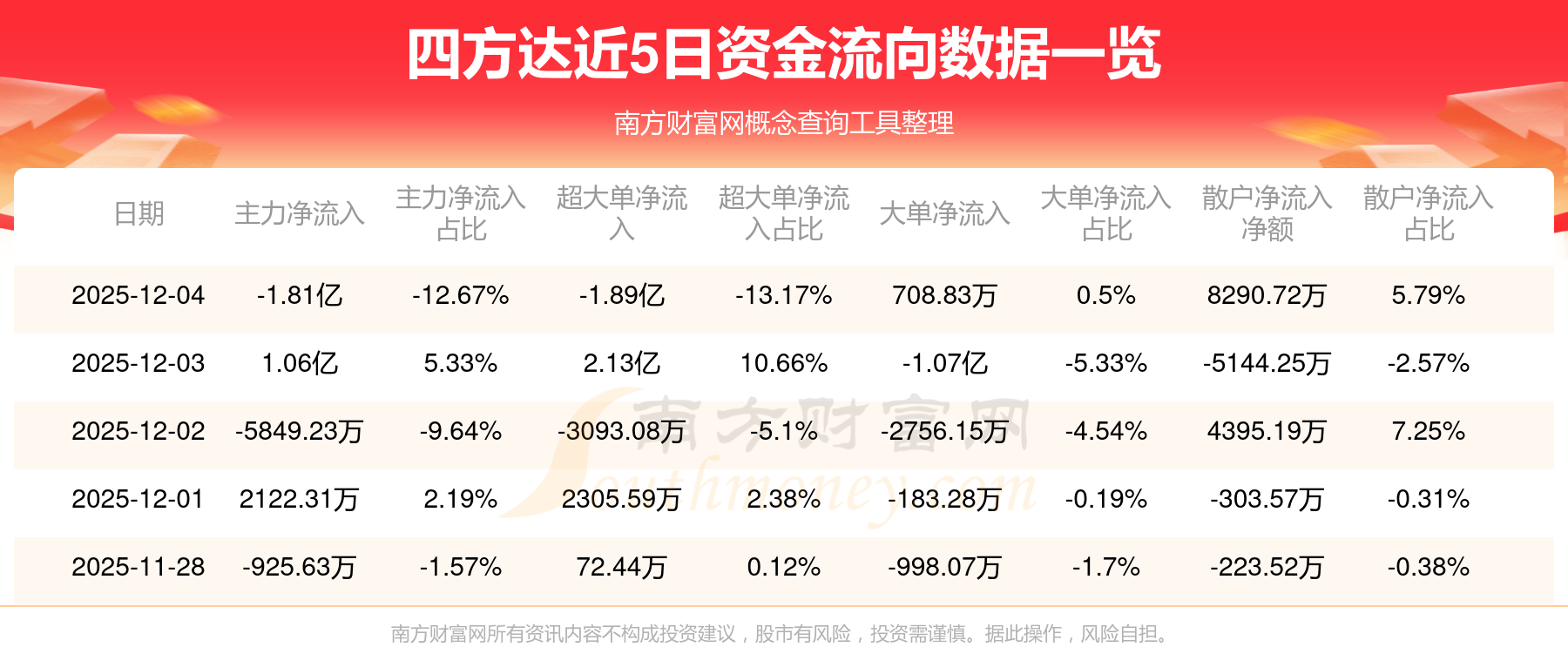 12月4日消息,四方達12月4日主力資金凈流出1.81億元,超大單資金凈流出1.89億元,大單資金凈流入708.83萬元,散戶資金凈流入8290.72萬元。