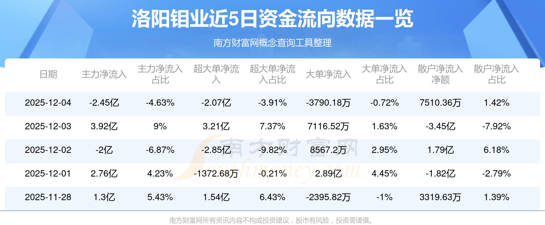 12月4日消息,洛陽鉬業(yè)12月4日主力凈流出2.45億元,超大單凈流出2.07億元,大單凈流出3790.18萬元,散戶凈流入7510.36萬元。
