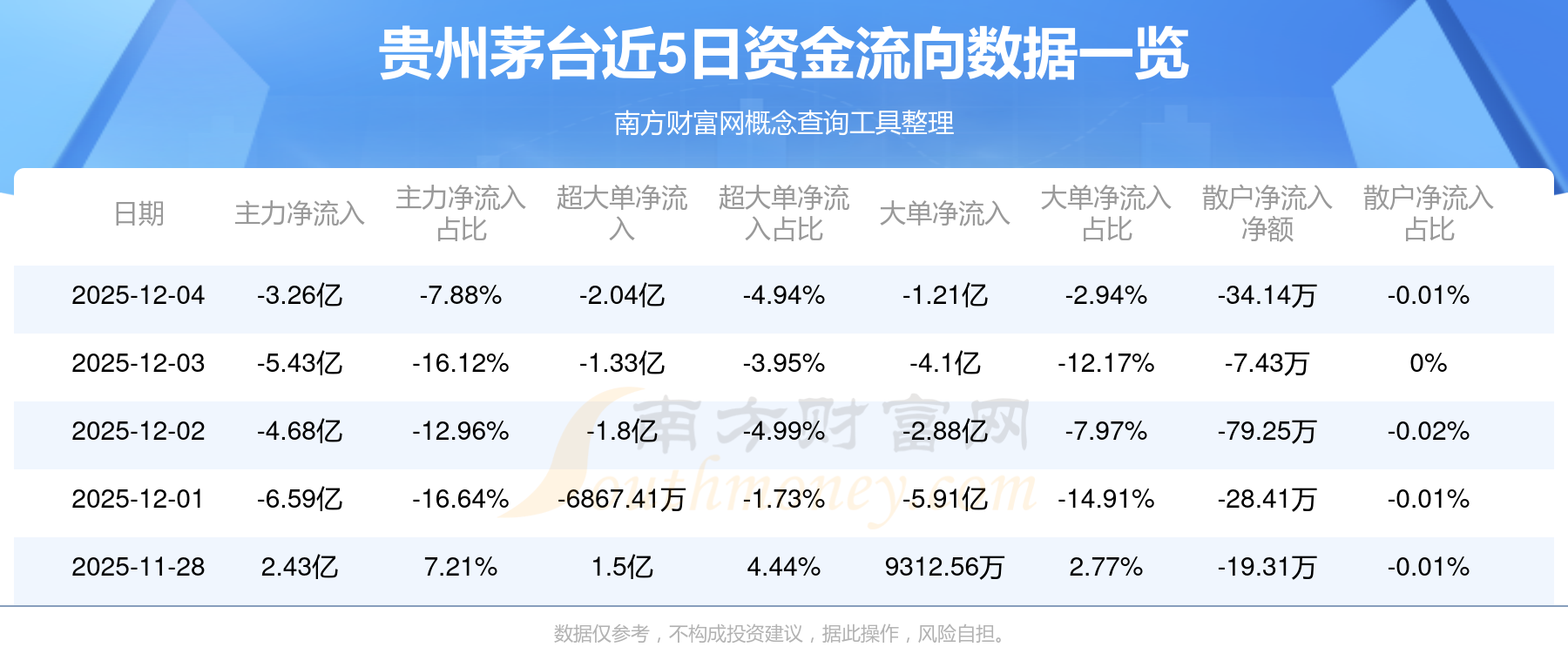 12月4日消息,貴州茅臺資金凈流出3.26億元,超大單凈流出2.04億元,換手率0.1%,成交金額16.96億元。