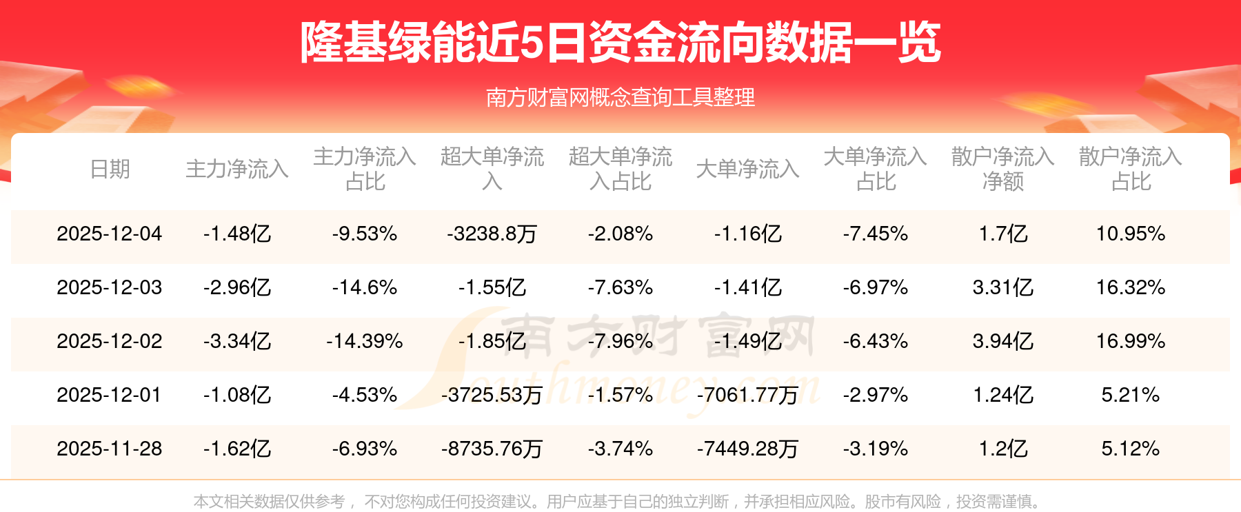12月4日消息,隆基綠能12月4日主力凈流出1.48億元,超大單凈流出3238.8萬元,大單凈流出1.16億元,散戶凈流入1.7億元。