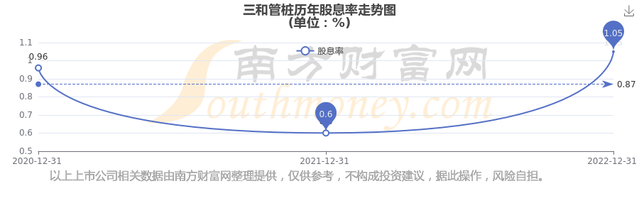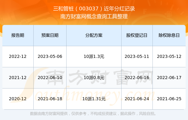 三和管樁最新一次公布的分紅方案為10派1.3元。本次權(quán)益分派股權(quán)登記日為2023年5月11日,除權(quán)除息日為2023年5月12日,派息日為2023年5月12日。