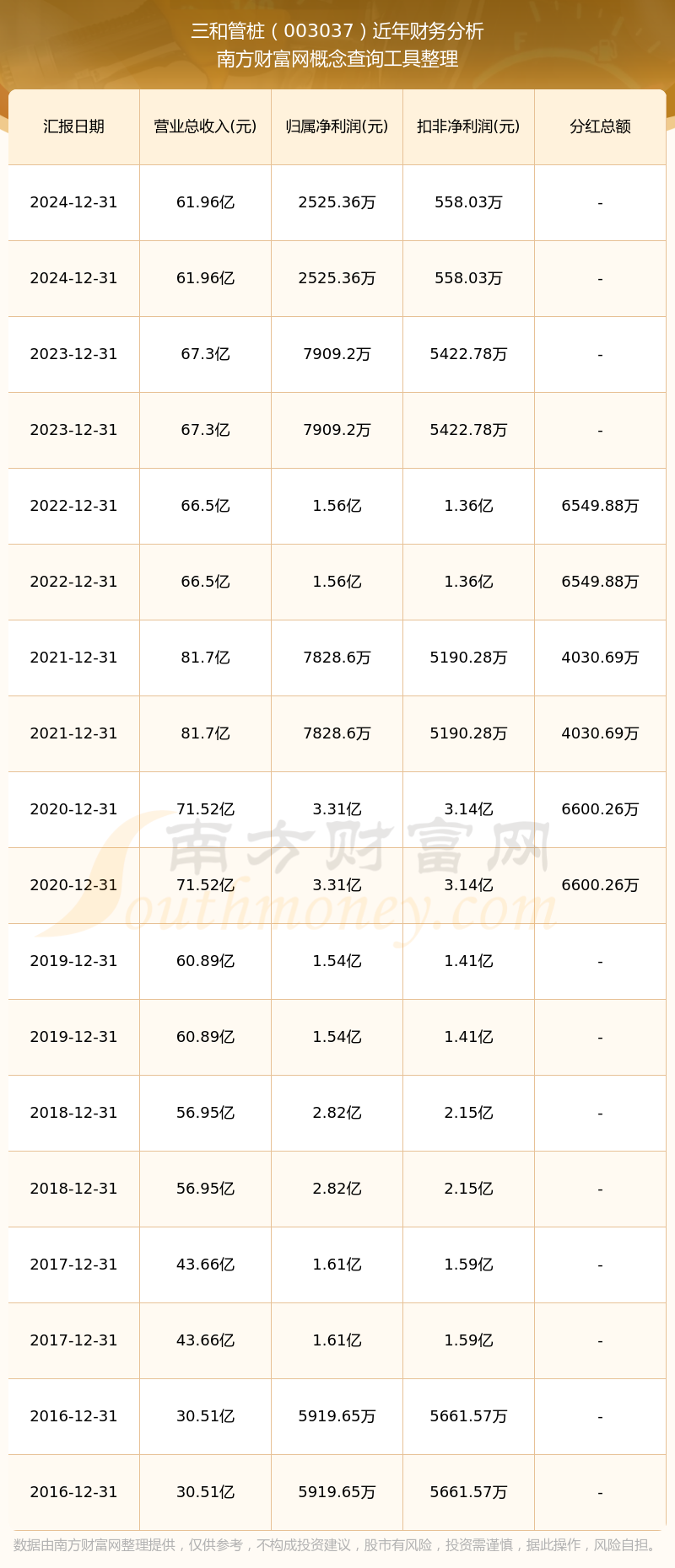 三和管樁2024年總營(yíng)收61.96億,同比增長(zhǎng)-7.93%;凈利潤(rùn)2525.36萬(wàn),同比增長(zhǎng)-68.07%;銷售毛利率10.02%。