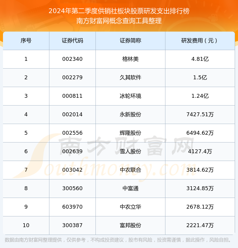 2024年第二季度,供銷(xiāo)社板塊股票研發(fā)支出排名如下:格林美(002340)研發(fā)支出總額高達(dá)4.81億,久其軟件(002279)和冰輪環(huán)境(000811)分別位居第二和第三,永新股份(002014)、輝隆股份(002556)、雪人股份(002639)、中農(nóng)聯(lián)合(003042)、中富通(300560)、中農(nóng)立華(603970)、富邦股份(300387)分別進(jìn)入前十,其研發(fā)支出總額分別排名第4-10名。