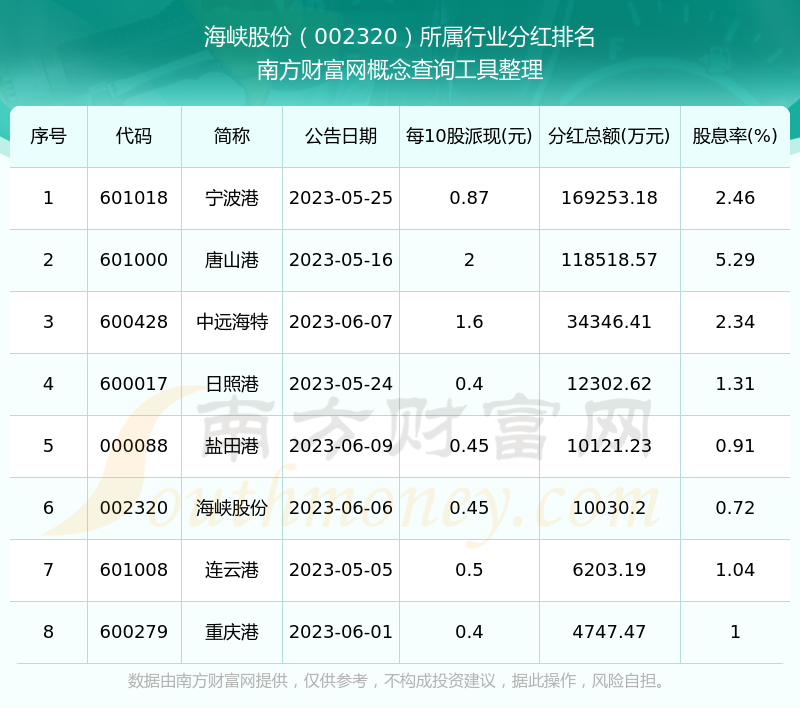 按照南方財(cái)富網(wǎng)趨勢(shì)選股系統(tǒng)統(tǒng)計(jì),海峽股份所屬行業(yè)為航運(yùn)港口行業(yè),航運(yùn)港口行業(yè)分紅排名情況如下表: