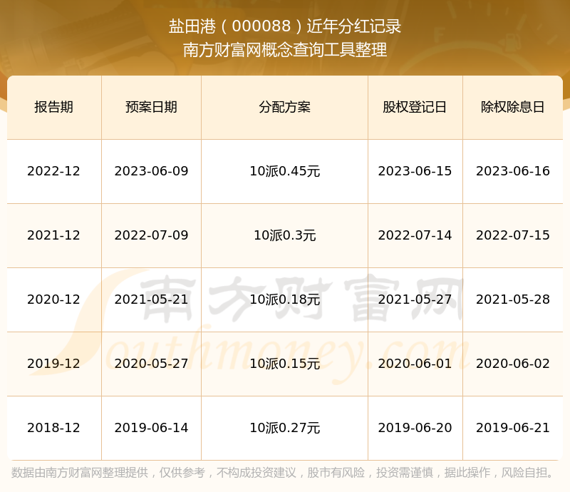 鹽田港最新一次公布的分紅方案為10派0.45元。本次權(quán)益分派股權(quán)登記日為2023年6月15日,除權(quán)除息日為2023年6月16日,派息日為2023年6月16日。