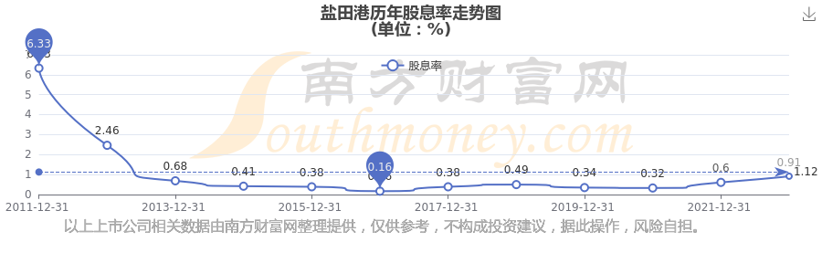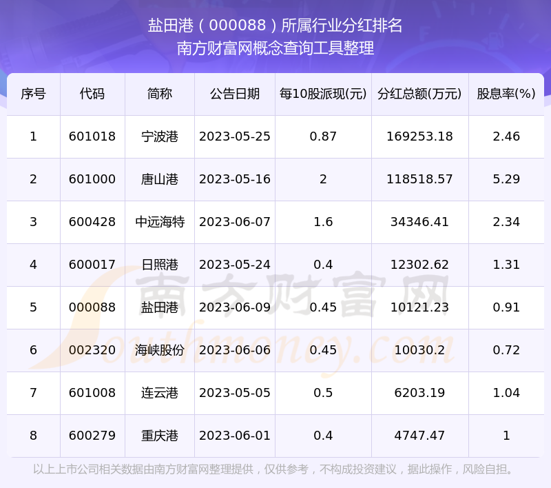 按照南方財富網(wǎng)趨勢選股系統(tǒng)統(tǒng)計,鹽田港所屬行業(yè)為航運港口行業(yè),航運港口行業(yè)分紅排名情況如下表: