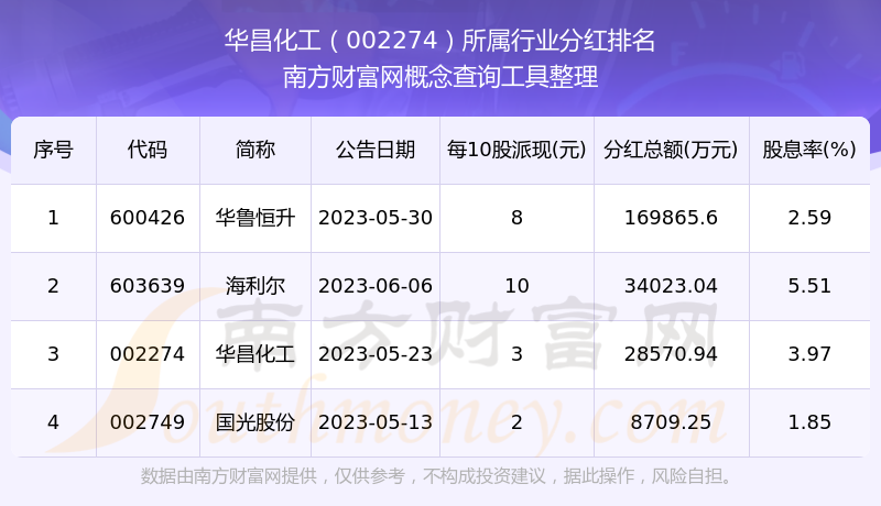 按照南方財(cái)富網(wǎng)趨勢(shì)選股系統(tǒng)統(tǒng)計(jì),華昌化工所屬行業(yè)為肥料行業(yè),肥料行業(yè)分紅排名情況如下表: