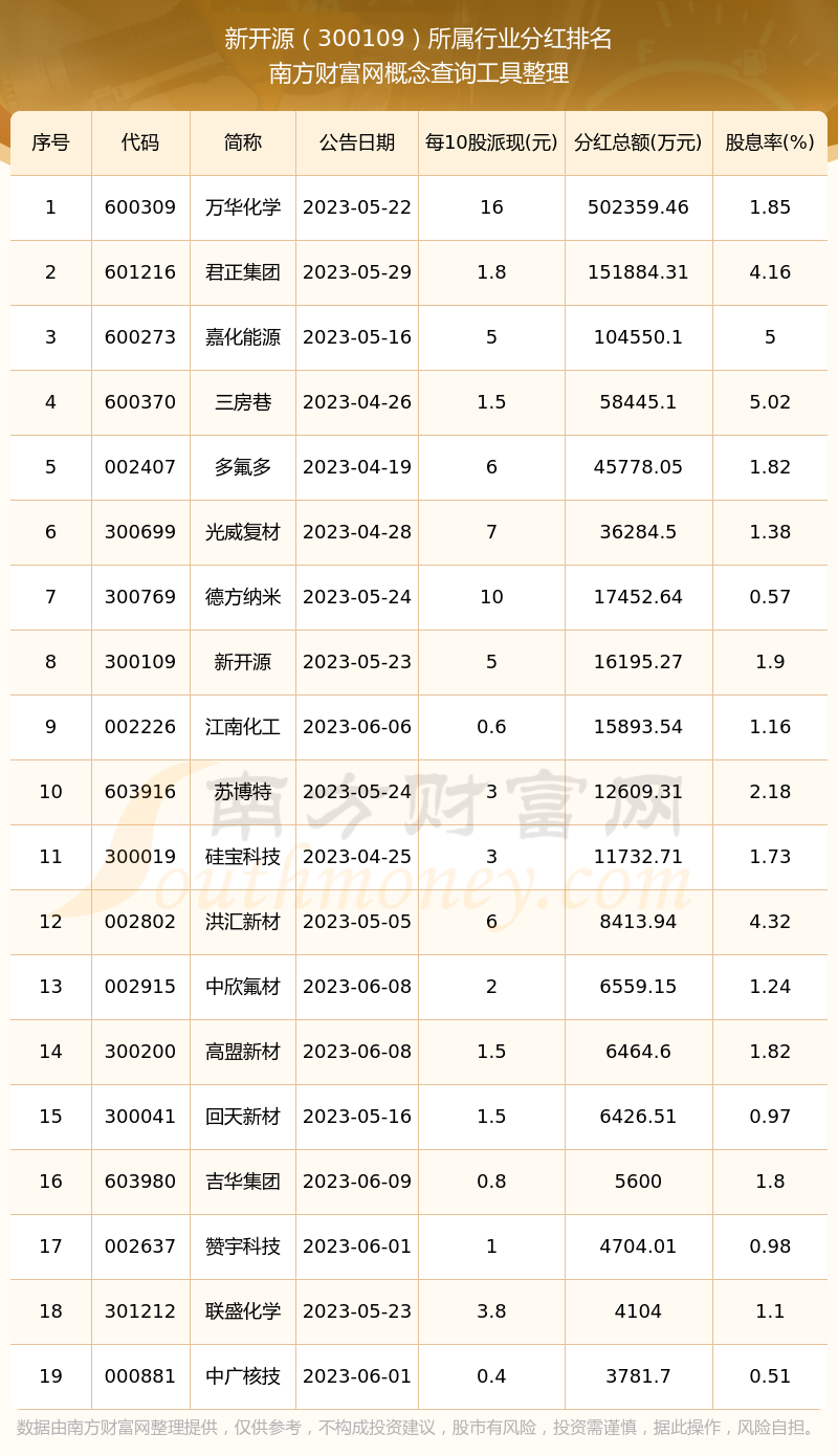 按照南方財(cái)富網(wǎng)趨勢選股系統(tǒng)統(tǒng)計(jì),新開源所屬行業(yè)為化學(xué)制品行業(yè),化學(xué)制品行業(yè)分紅排名情況如下表: