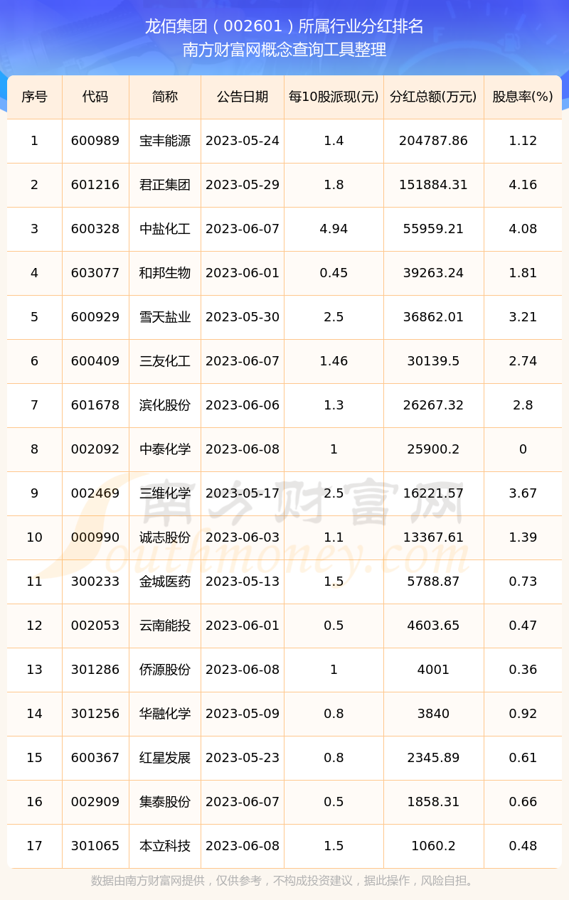 按照南方財富網(wǎng)趨勢選股系統(tǒng)統(tǒng)計,龍佰集團所屬行業(yè)為鈦白粉行業(yè),鈦白粉行業(yè)分紅排名情況如下表: