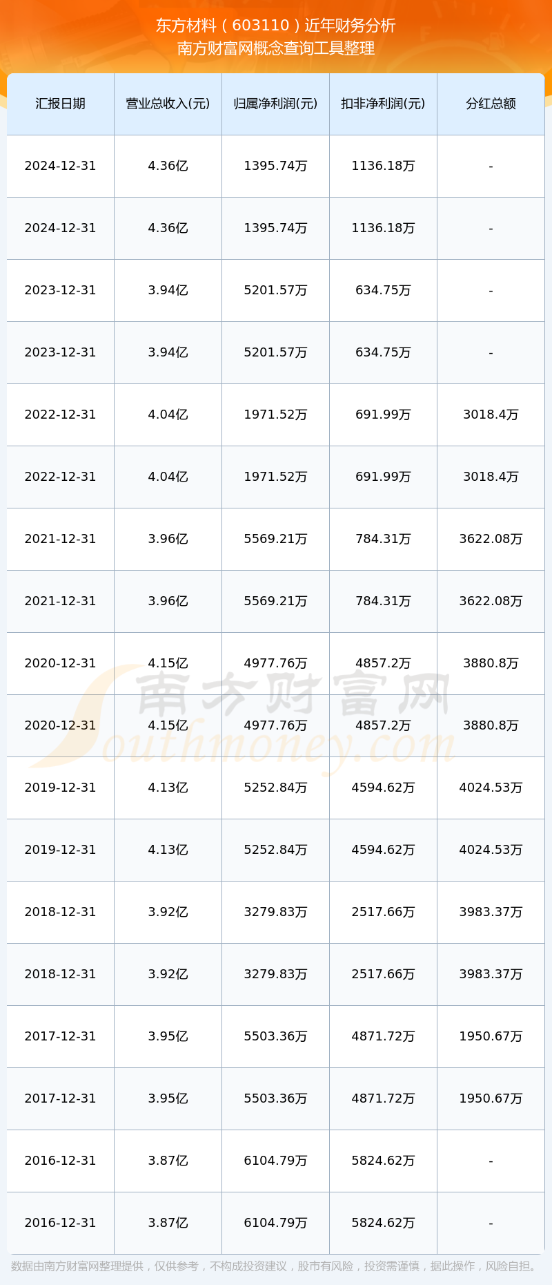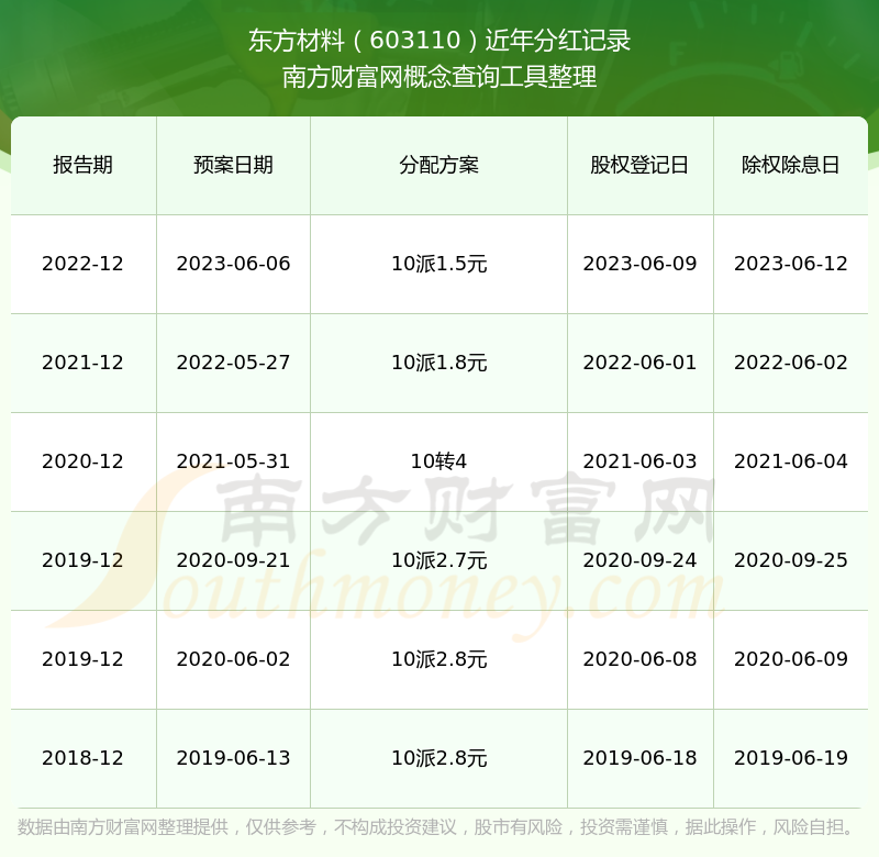 東方材料最新一次公布的分紅方案為10派1.5元。本次權(quán)益分派股權(quán)登記日為2023年6月9日,除權(quán)除息日為2023年6月12日,派息日為2023年6月12日。