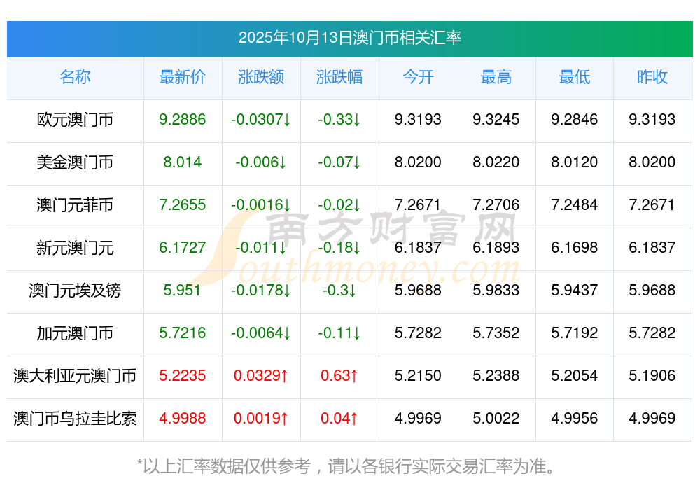 2025年10月13日澳門幣相關(guān)匯率查詢