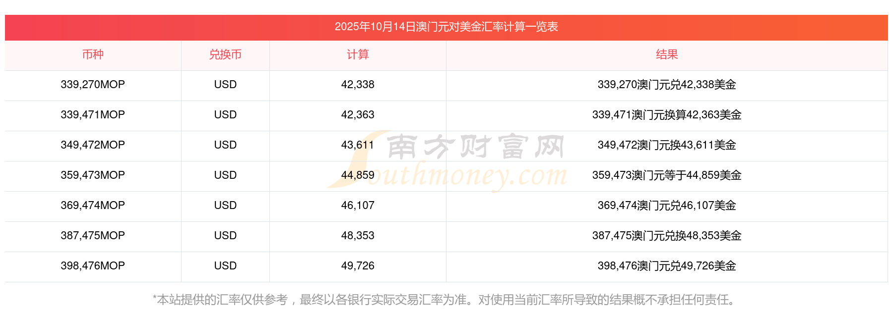 2025年10月14日匯率行情:36澳門元對美金匯率多少