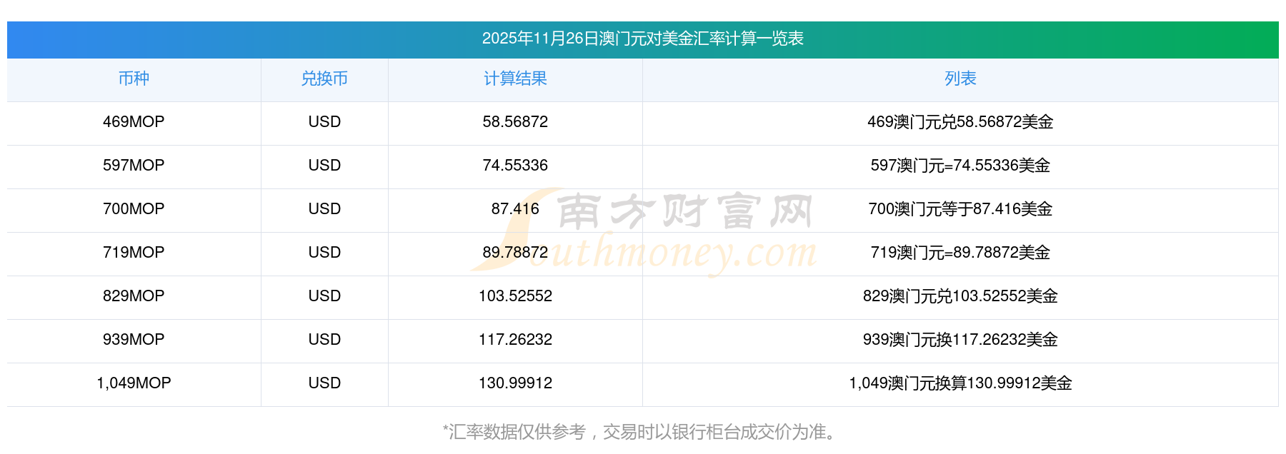 南方財富網(wǎng)為您提供澳門元對美金匯率最新價格詳情。
