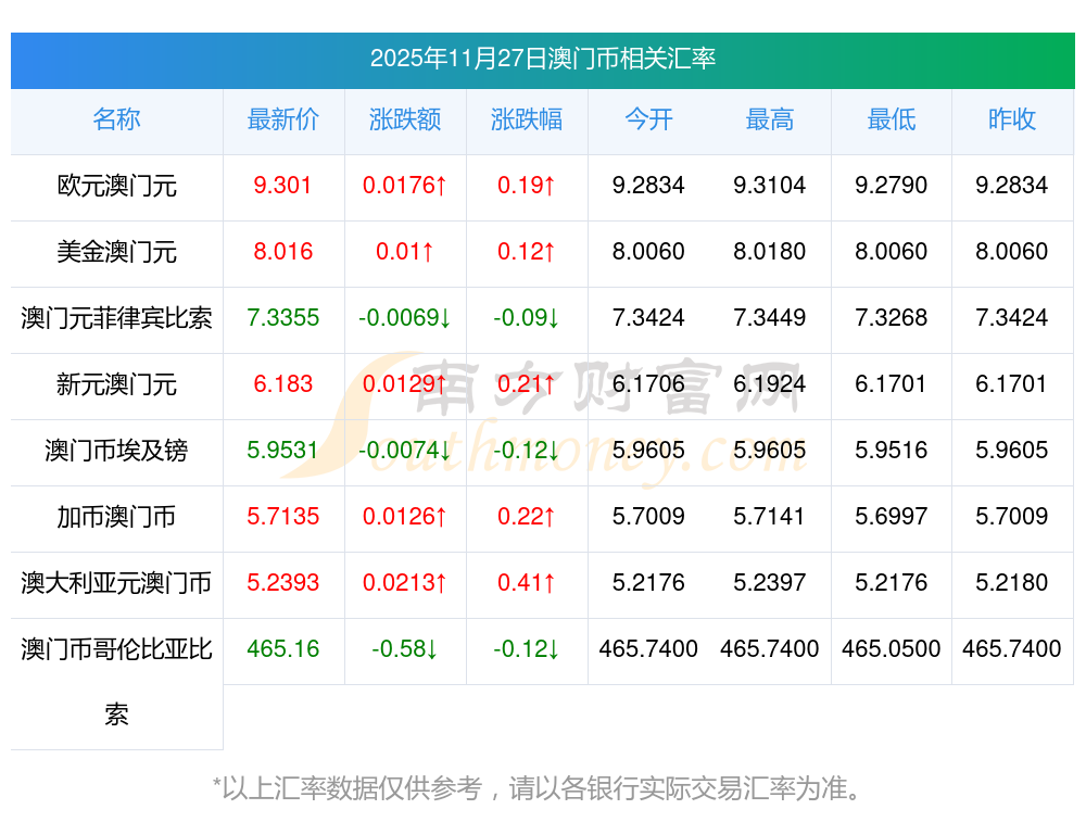 2025年11月27日澳門幣相關(guān)匯率查詢