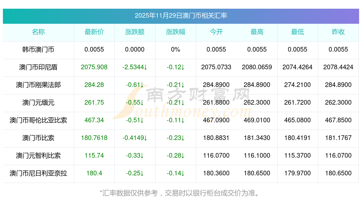 2025年11月29日澳門幣相關(guān)匯率查詢