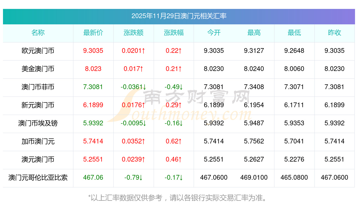 根據(jù)2025年11月29日匯率,澳門元兌換緬元匯率最新價(jià)261.750000,今開價(jià)261.7500,昨收價(jià)261.7500,最高價(jià)262.3000,最低價(jià)261.7200。