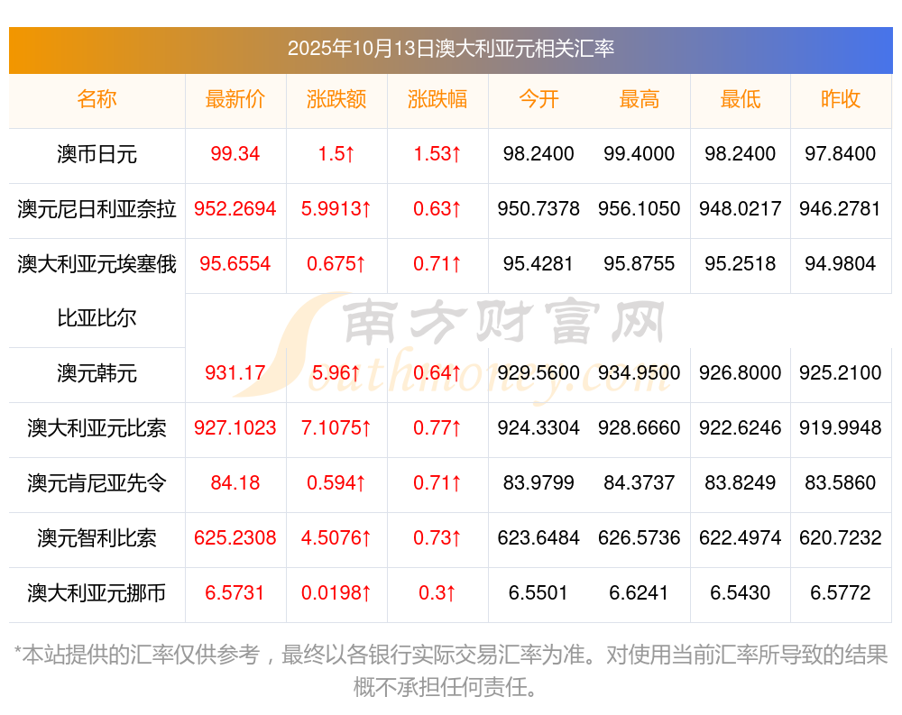 2025年10月13日澳大利亞元相關(guān)匯率查詢(xún)