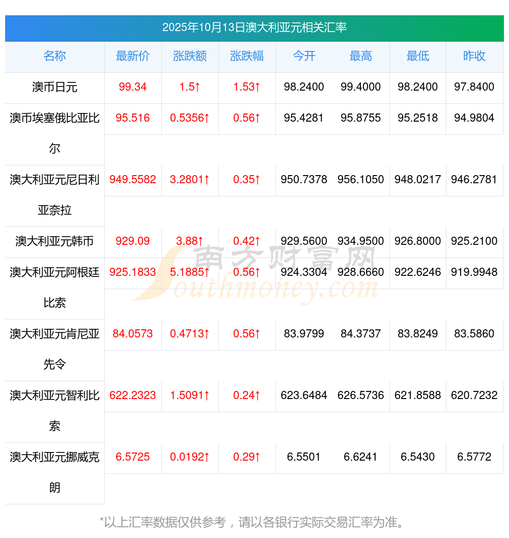 2025年10月13日澳大利亞元相關匯率查詢