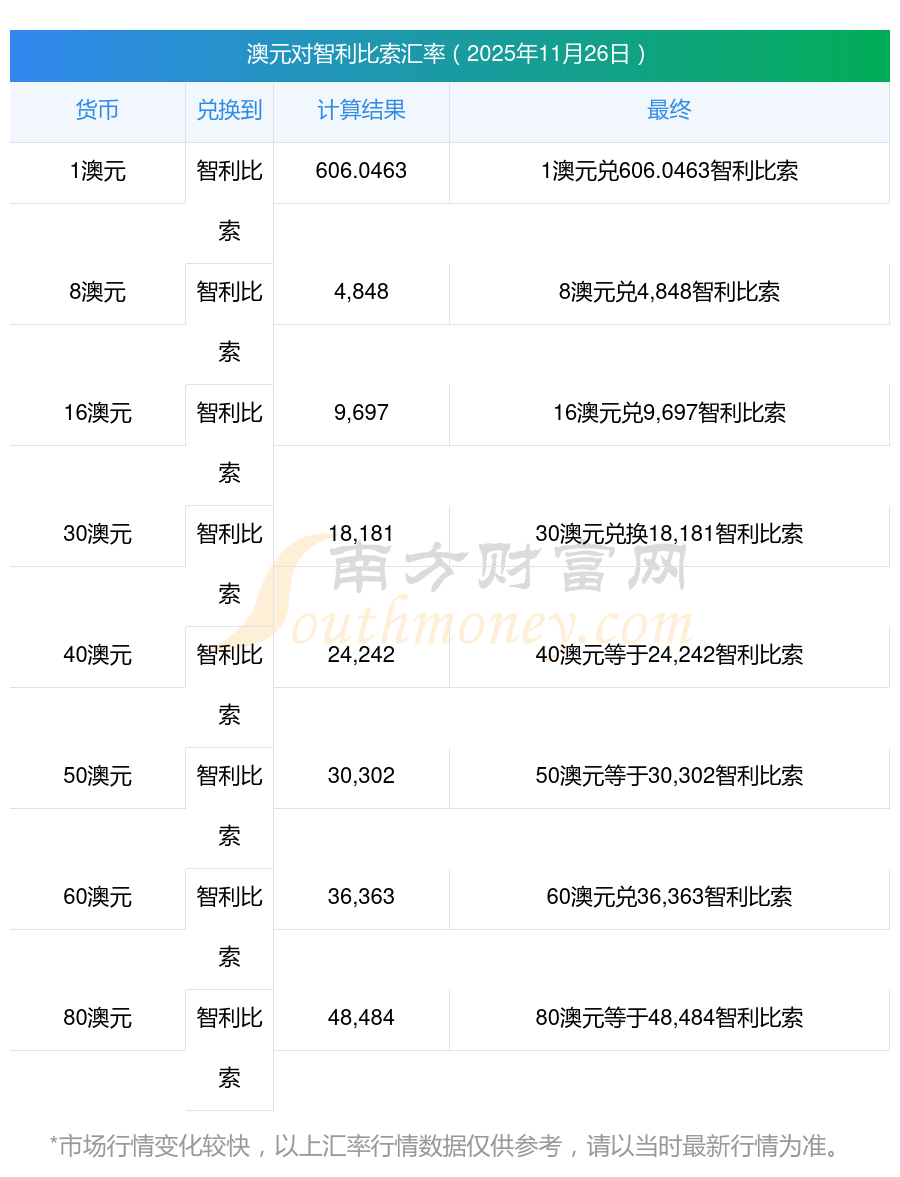 南方財富網(wǎng)為您提供澳元對智利比索匯率最新價格詳情。