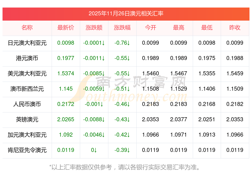 根據(jù)2025年11月26日匯率,澳元兌換丹幣匯率最新價(jià)4.193900,今開價(jià)4.1758,昨收價(jià)4.1759,最高價(jià)4.1964,最低價(jià)4.1736。