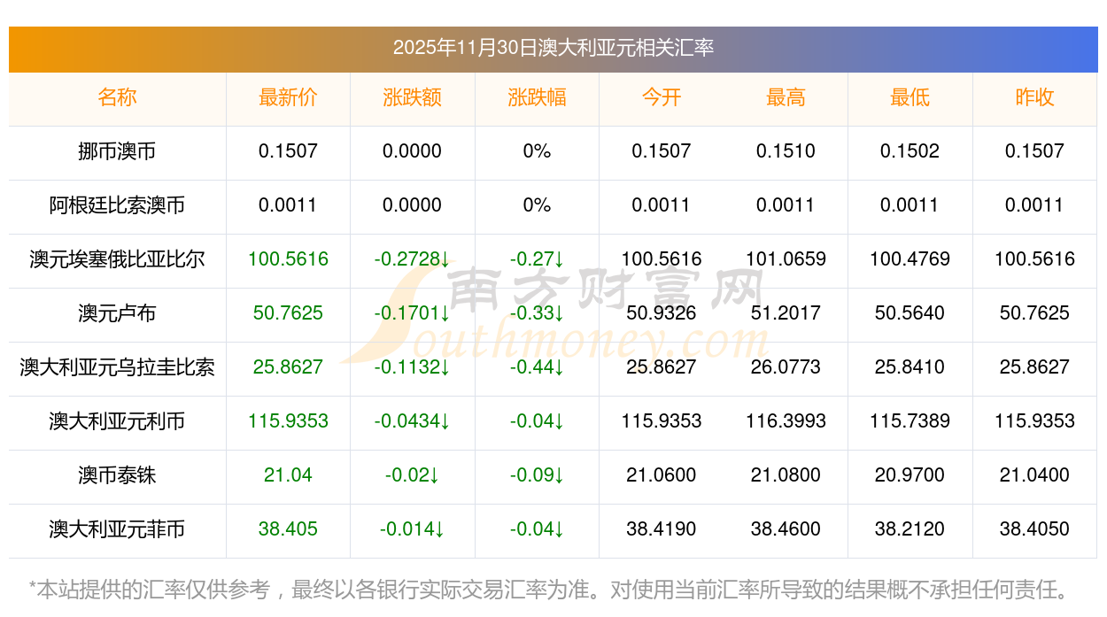 根據(jù)2025年11月30日匯率計算,AUD兌換PHP匯率最新價38.405000,今開價38.4190,昨收價38.4050,最高價38.4600,最低價38.2120。