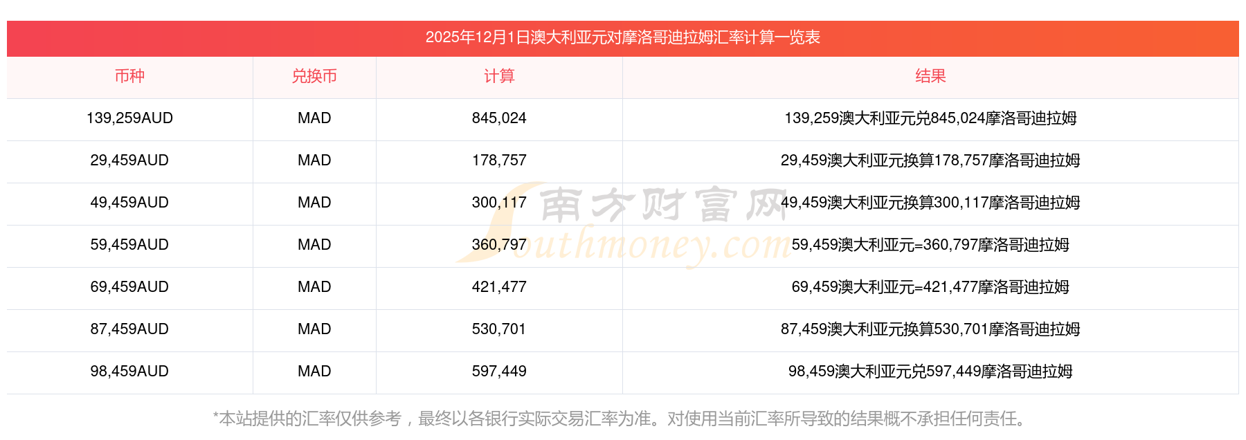 澳大利亞元兌換摩洛哥迪拉姆匯率查詢一覽表(2025年12月1日)