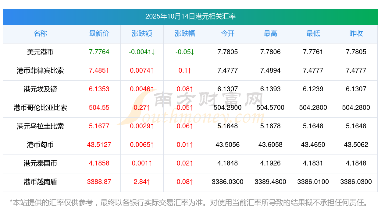根據(jù)2025年10月14日匯率,港元兌換蘭特匯率最新2.240600,今開2.2262,昨收2.2262,最高2.2407,最低2.2229。