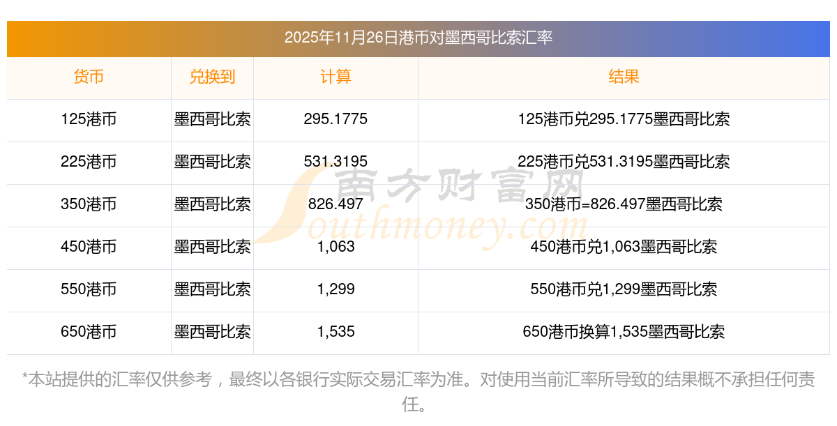 今日實時匯率_今天港幣換墨西哥比索匯率計算表2025年11月26日