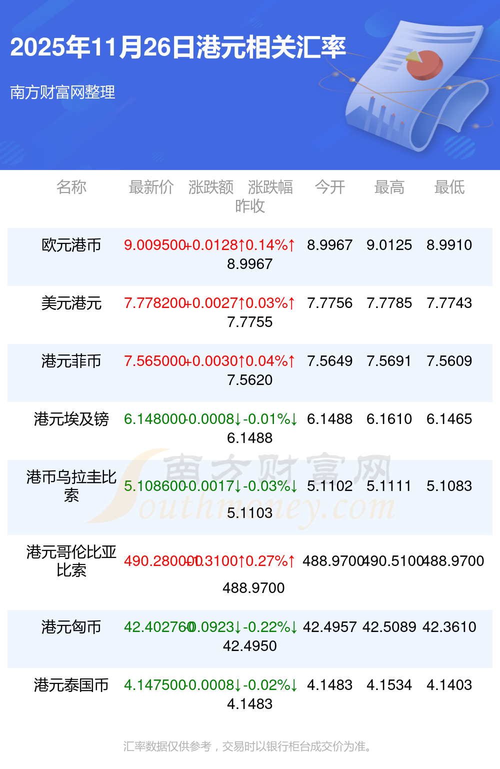 根據(jù)2025年11月26日匯率,港元兌換哥倫比亞比索匯率最新490.280000,今開(kāi)488.9700,昨收488.9700,最高490.5100,最低488.9700。