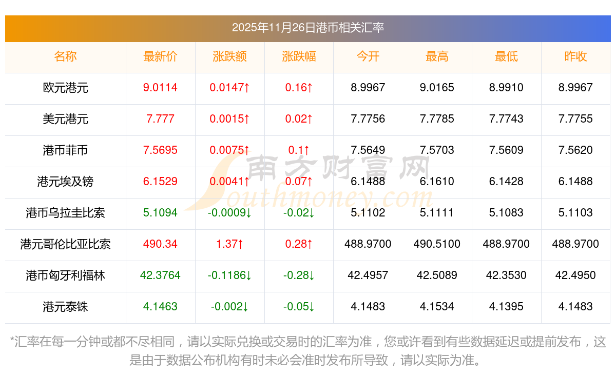 2025年11月26日港幣相關(guān)匯率查詢