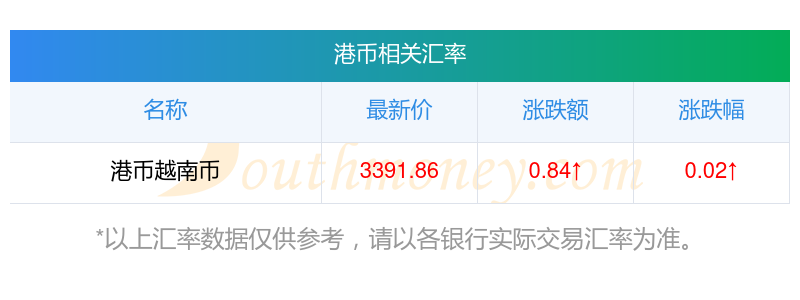南方財(cái)富網(wǎng)為您提供港幣對(duì)越南幣匯率最新價(jià)格詳情。