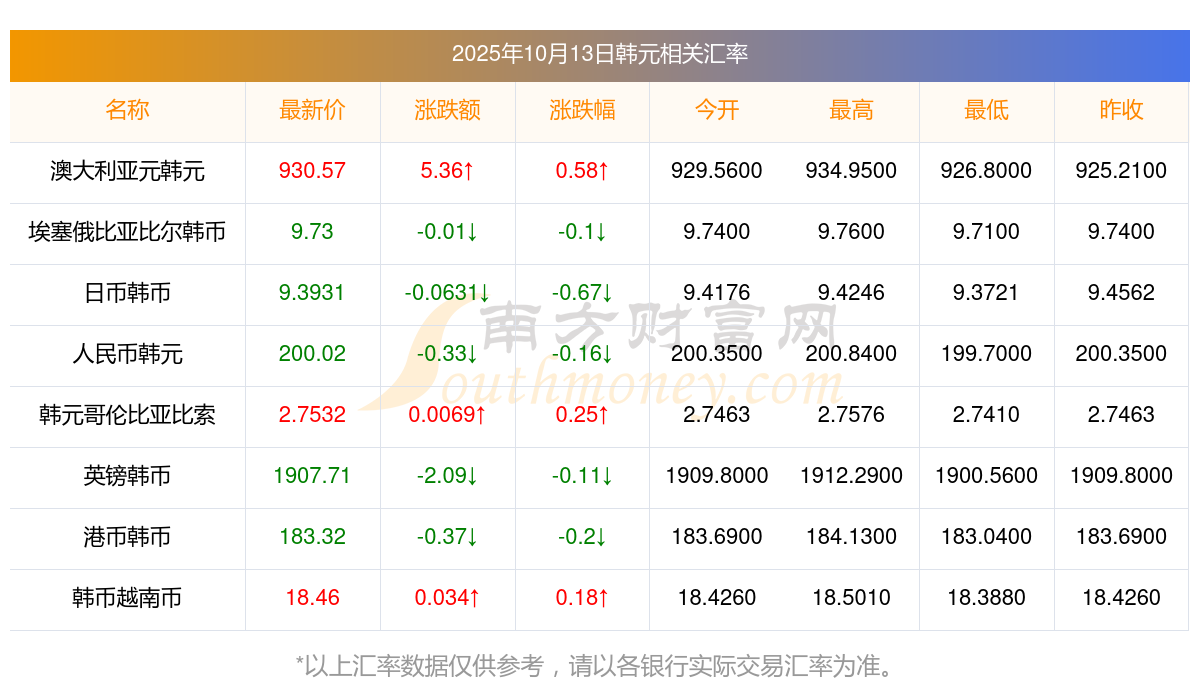 2025年10月13日最新消息,韓元兌換哥倫比亞比索最新匯率為2.753200,今開為2.7463,昨收為2.7463,最高為2.7576,最低為2.7410。