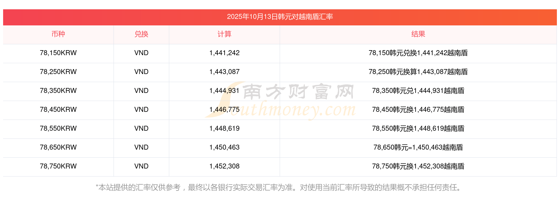 南方財富網為您提供韓元對越南盾匯率最新價格詳情。