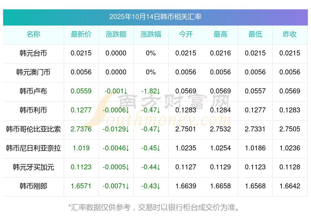 2025年10月14日最新消息,韓幣兌換哥倫比亞比索最新匯率為2.737600,今開為2.7501,昨收為2.7505,最高為2.7532,最低為2.7331。