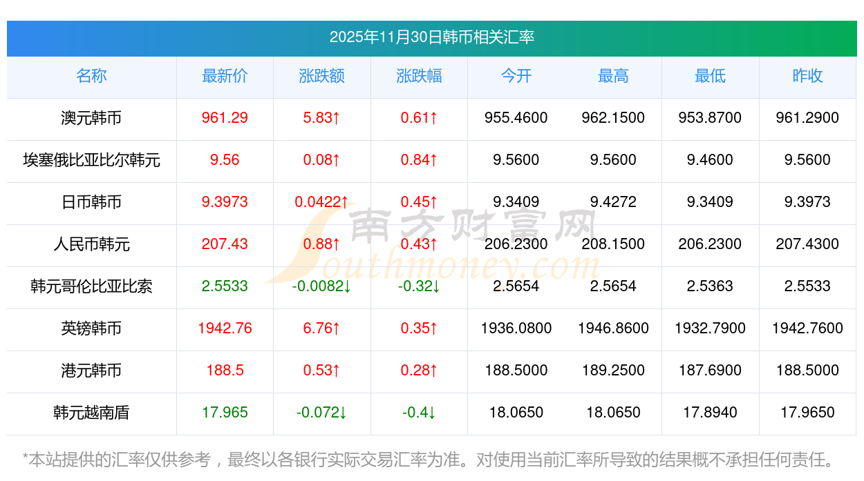 根據(jù)2025年11月30日匯率,韓幣兌換澳門幣匯率最新0.005500,今開0.0055,昨收0.0055,最高0.0055,最低0.0055。