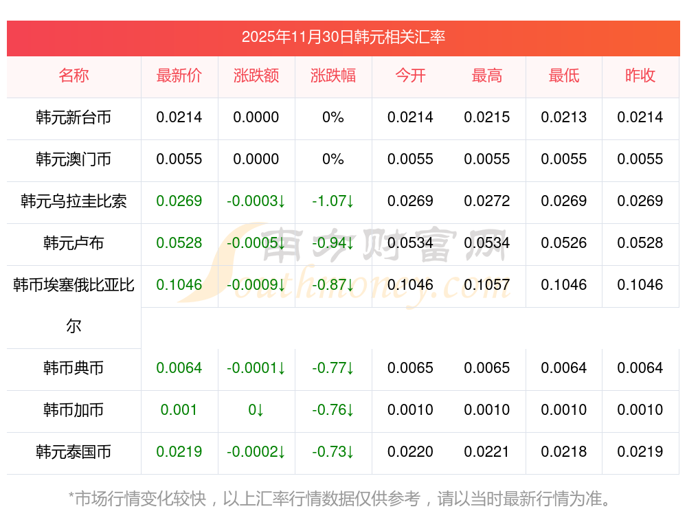 2025年11月30日韓元相關(guān)匯率查詢