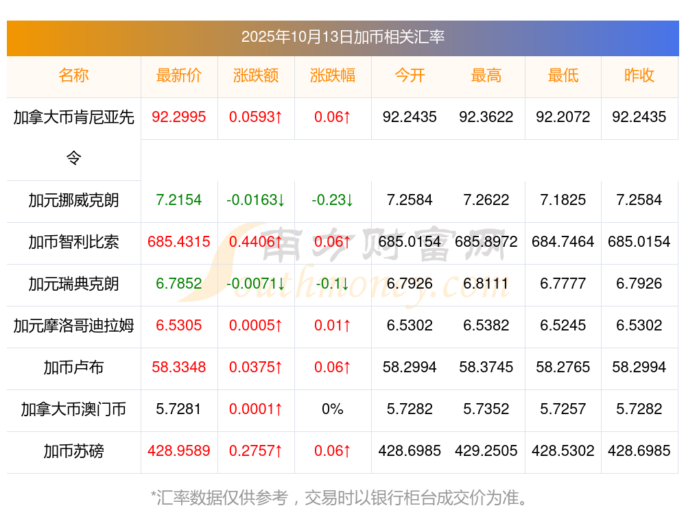 加幣對紅比索匯率行情一覽表(2025年10月13日)