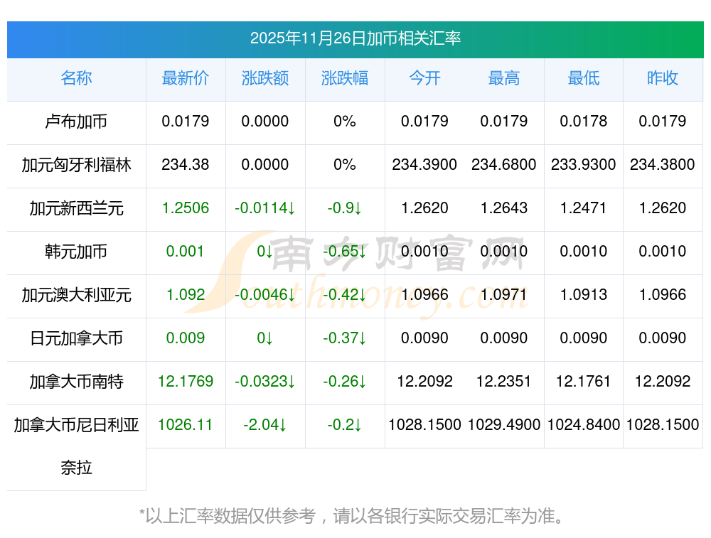 根據(jù)2025年11月26日匯率,加幣兌換牙買加元匯率最新價113.740000,今開價113.6200,昨收價113.6200,最高價114.0300,最低價113.5500。