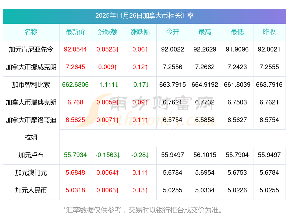 2025年11月26日加拿大幣相關(guān)匯率查詢