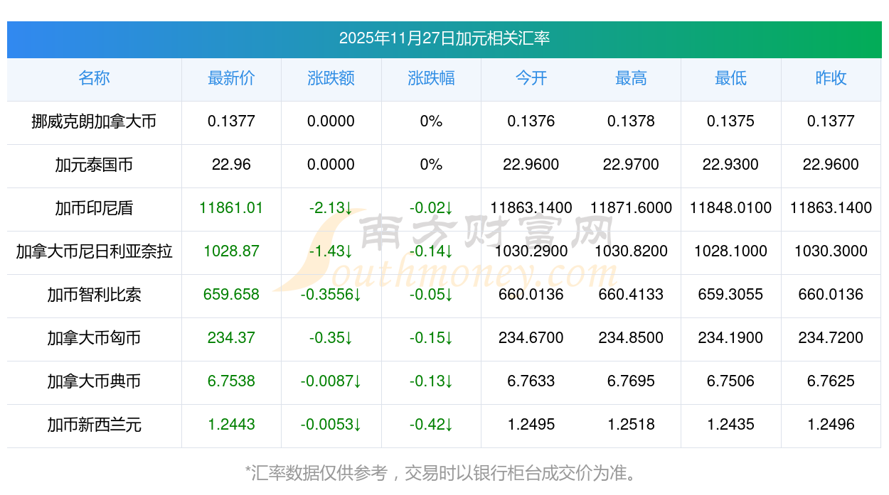 根據(jù)2025年11月27日匯率計算,CAD兌換PLN匯率最新價2.599500:今日開價2.5990,昨日收價2.5991,最高價2.6016,最低價2.5969。