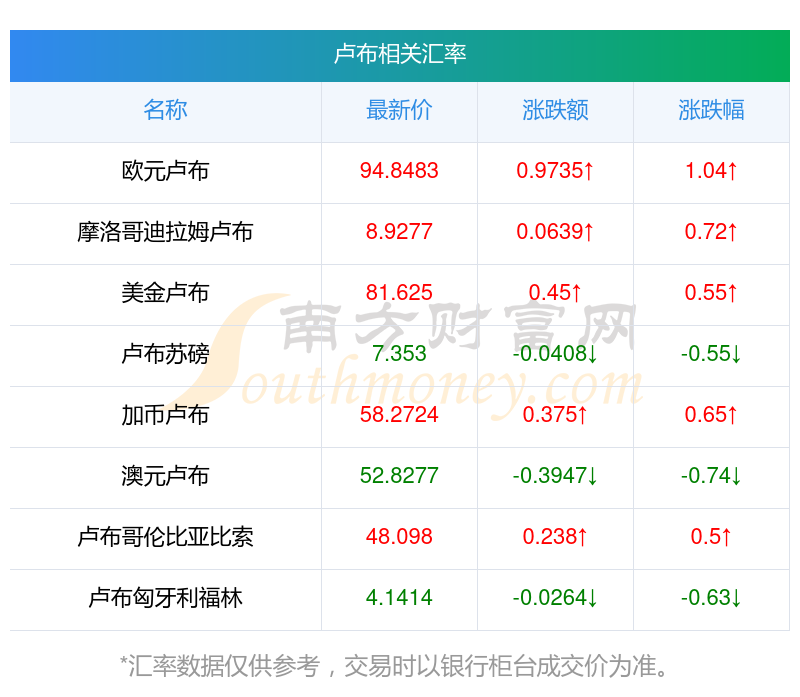 根據(jù)2025年10月12日匯率,盧布兌換哥倫比亞比索匯率最新價(jià)48.098000,今開(kāi)價(jià)47.8970,昨收價(jià)48.0980,最高價(jià)48.2740,最低價(jià)47.3400。