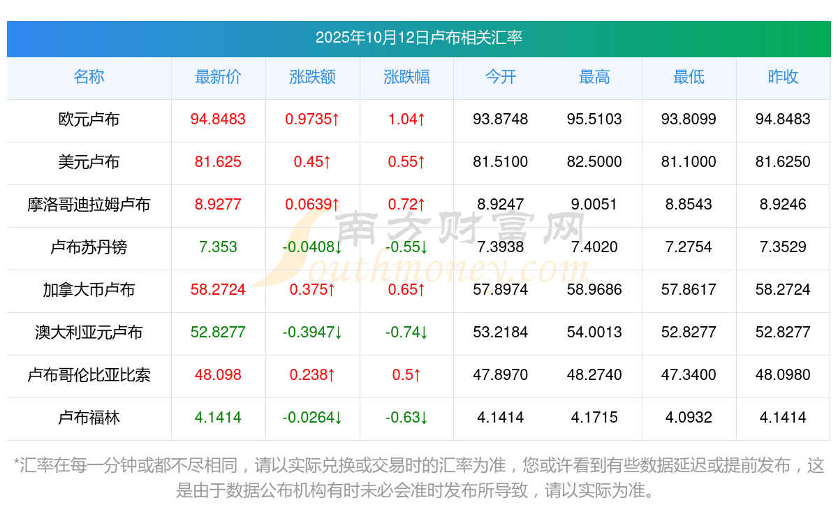 根據(jù)2025年10月12日匯率,盧布兌換埃塞俄比亞比爾匯率最新1.797900,今開1.7979,昨收1.7979,最高1.8178,最低1.7623。