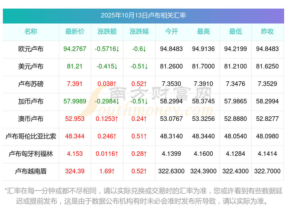 根據2025年10月13日匯率,盧布兌換剛果法郎匯率最新價29.300000,今開價29.2100,昨收價29.0800,最高價29.3000,最低價29.0600。