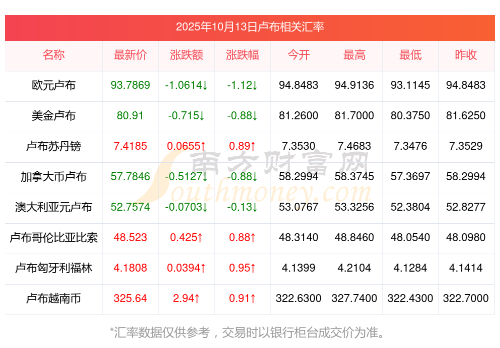 2025年10月13日盧布相關(guān)匯率查詢