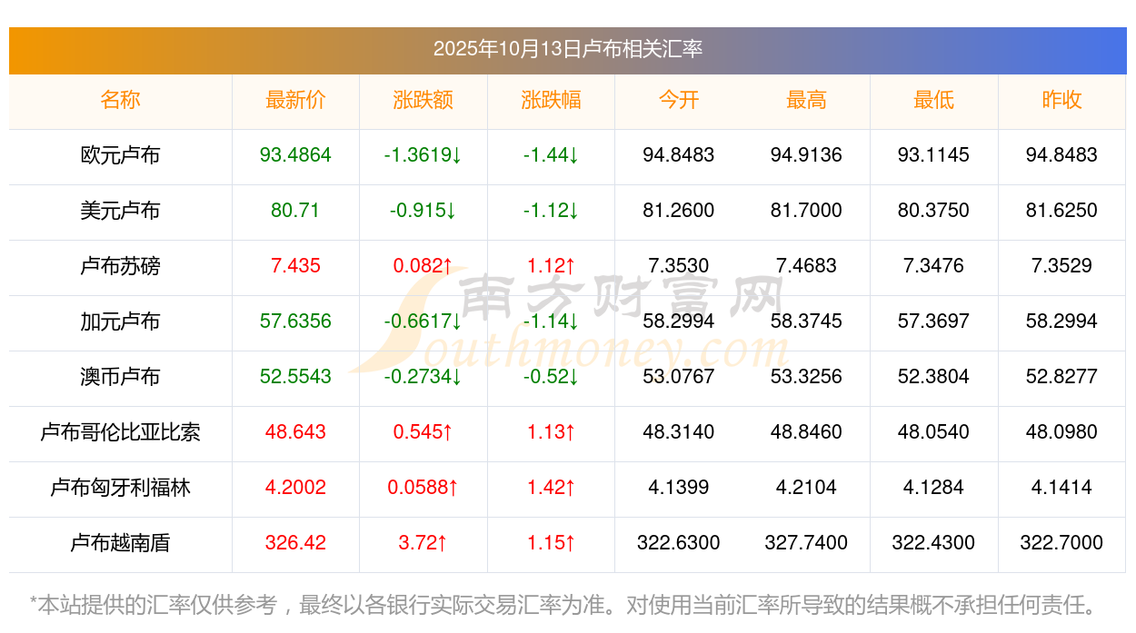 根據(jù)2025年10月13日匯率計(jì)算,盧布兌換肯尼亞先令匯率最新價(jià)1.600800,今開價(jià)1.5894,昨收價(jià)1.5823,最高價(jià)1.6069,最低價(jià)1.5814。