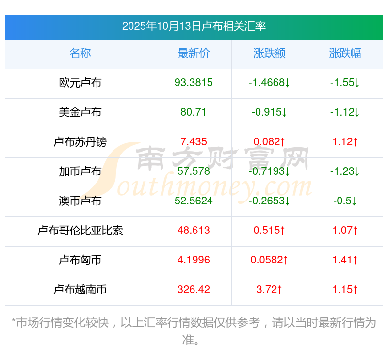 2025年10月13日盧布對(duì)林吉特匯率行情一覽表