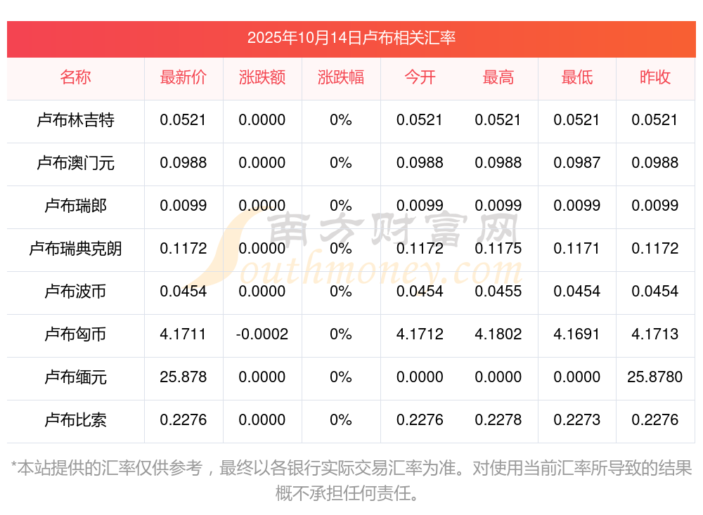 根據(jù)今天2025年10月14日匯率計(jì)算,RUB兌換MOP匯率最新價(jià)0.098800,今開價(jià)0.0988,昨收價(jià)0.0988,最高價(jià)0.0988,最低價(jià)0.0987。